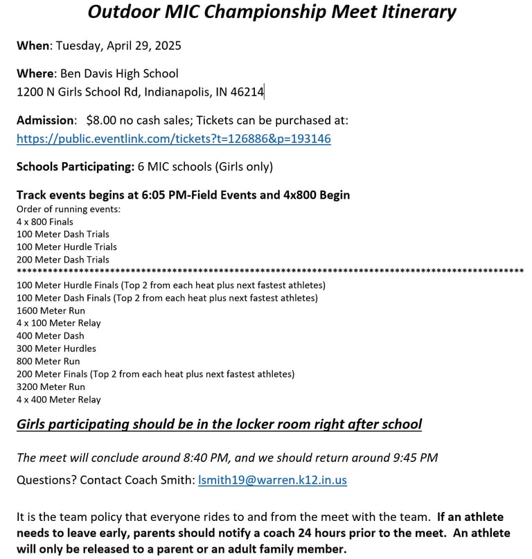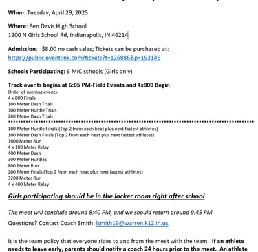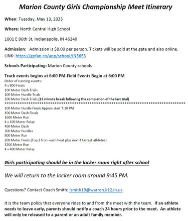 All competing athletes will meet in the locker room located at the track stadium. You must ride the bus to the meet and back to school unless other arrangements have been approved 24 hours before the meet.If you are not competing you are NOT required to attend the track meet.